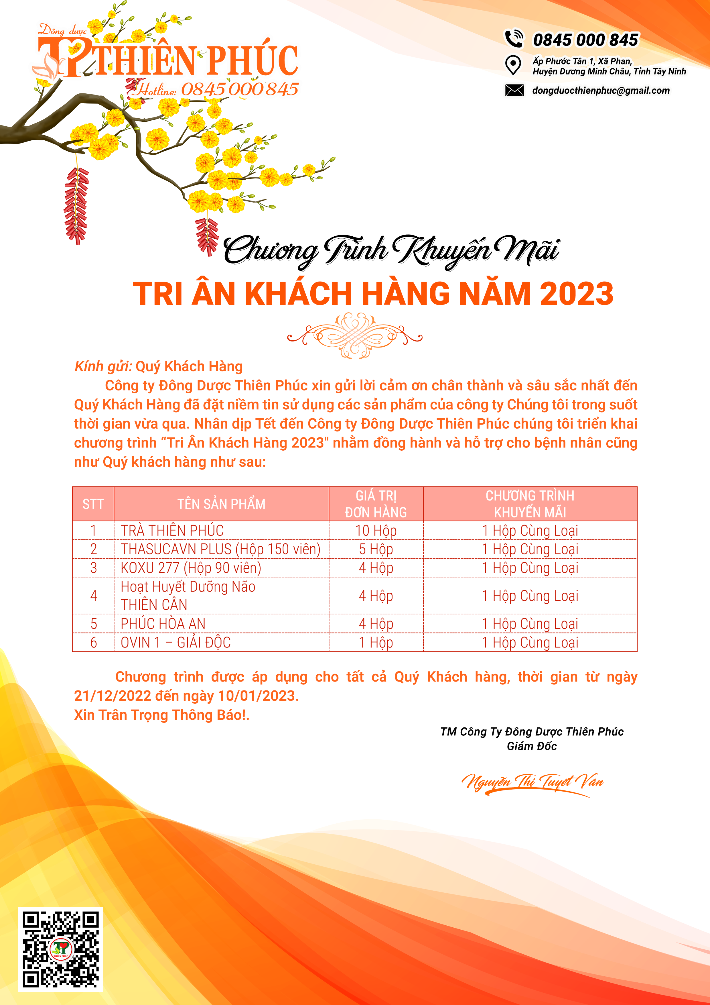 Nhằm tri ân Quý Khách hàng đã tin tưởng và đồng hành cùng Công ty Đông Dược Thiên Phúc trong thời gian vừa qua. Công ty Đông Dược Thiên Phúc xin gửi đến Quý khách hàng lời chúc tốt đẹp nhất và bên cạnh đó là Chương trình “Tri Ân Khách Hàng 2023”. KÍNH CHÚC QUÝ KHÁCH HÀNG ĐÓN XUÂN AN LÀNH VÀ HẠNH PHÚC